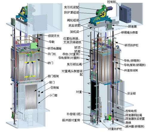 組成:主要由限速器、安全鉗、緩沖器、端站保護(hù)裝置等